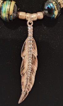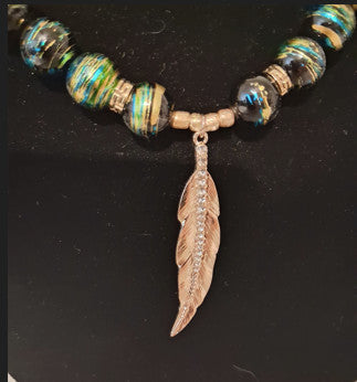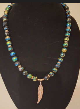 This necklace is hand made with Blue and gold Natural beads, with Gold Leaf Pendant