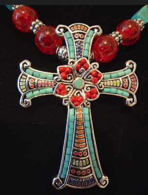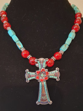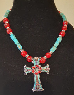 This is handmade Aventurine Red and Turquoise Beads,Red , Turquoise and Silver Cross Pendant,18 inches long