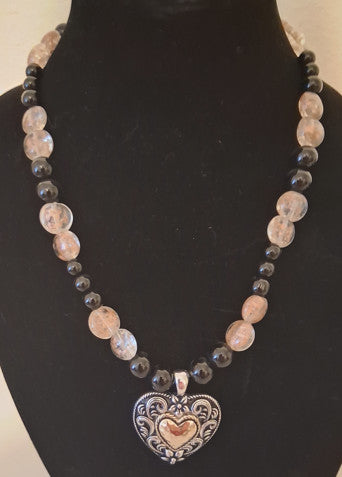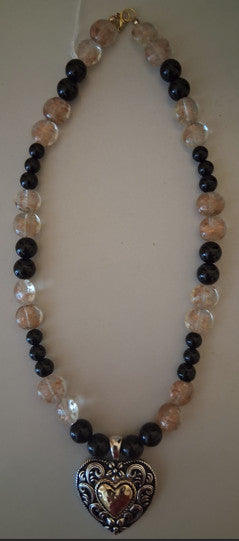the necklace is 20 inches longs and the colors are Onyx and white beads with a shimmer of gold in them, Pendant is a silver and gold heart, special Hand Made