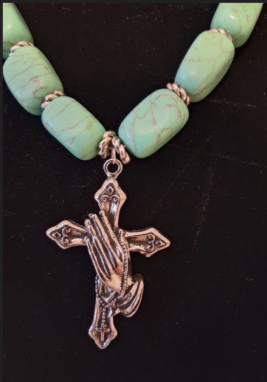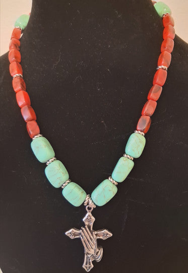 the necklace has Turquoise stone with Red beds and a cross pendant with praying hands